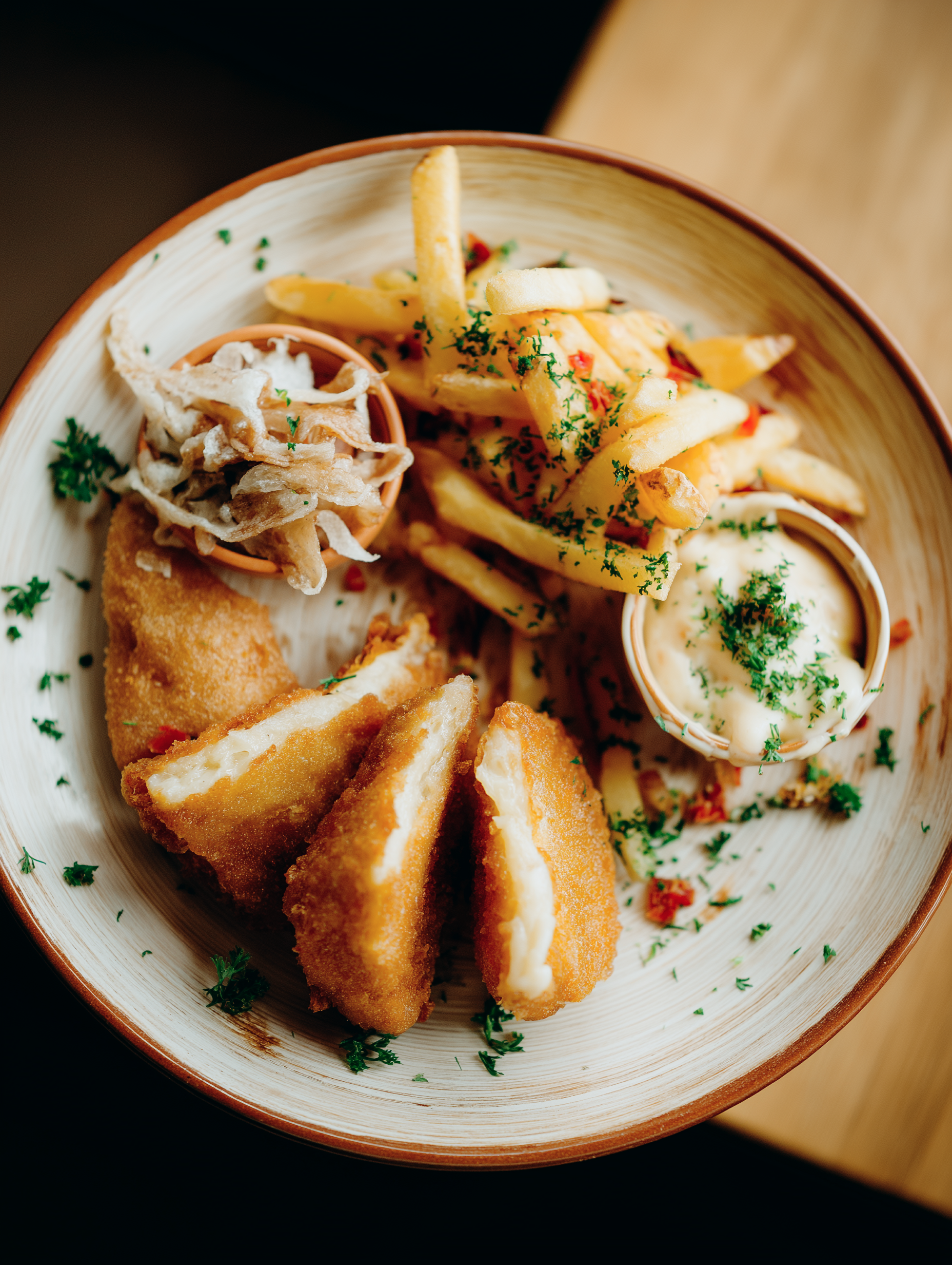 Krispigt gyllene ost, serverad med pommes och krämig hemgjord tartar.