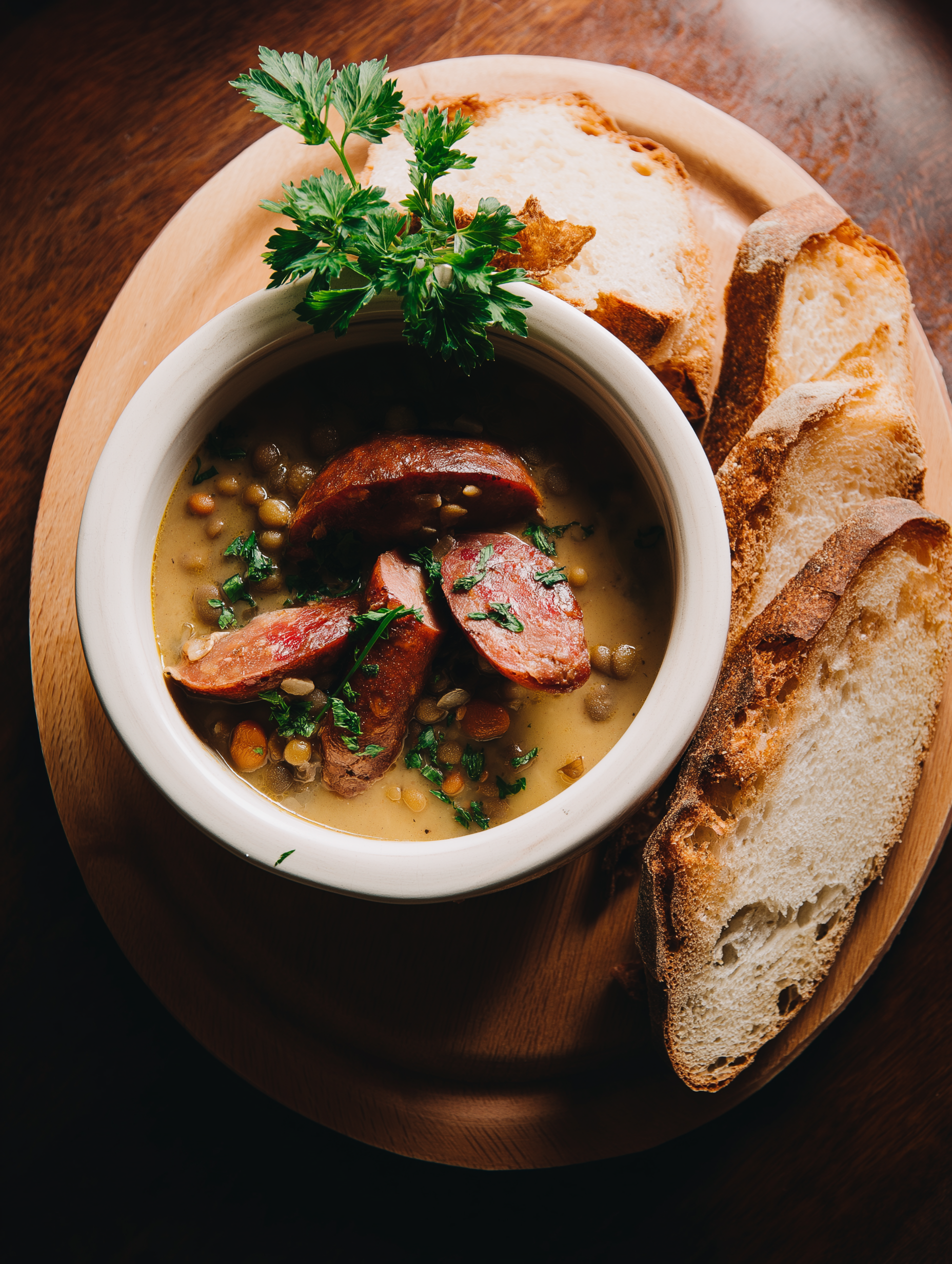 Rejäl linsoppa med rökig korv, en rustik tjeckisk favorit.